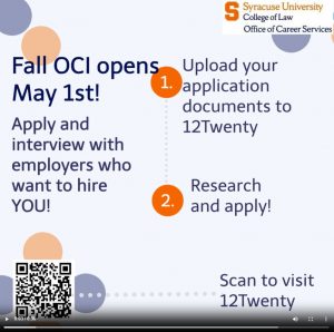 Take advantage of the Syracuse Law OCS guides available on Orange CORE, including the Plug & Play Resume Building Template, Resume Guide, and Cover Letter & Other Application Materials, to ensure your application documents are polished and professional. Additionally, please review the attached OCI FAQ for key details. Please schedule an appointment with your Career Coach if you need assistance with your application documents.