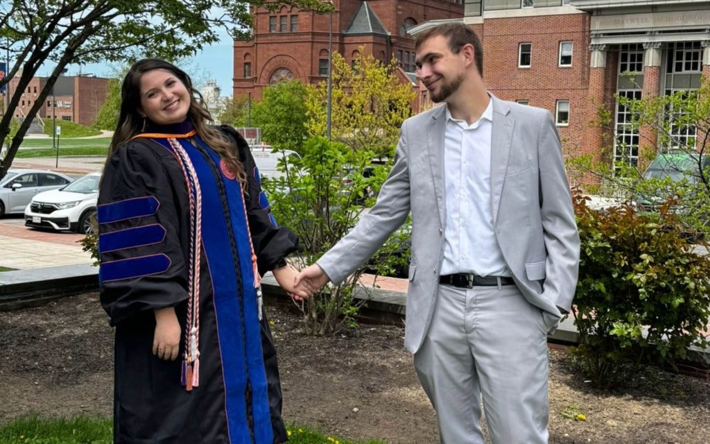 When she arrived in Syracuse, her story continued with another twist of fate. She mistakenly arrived too early, thinking orientation started on August 7 instead of August 14. New to the city, alone in her apartment, and eager to meet people, she downloaded a few dating apps. On her second day here in Syracuse, she went out for a pizza dinner with Arick for a first date, and the two have been inseparable since.