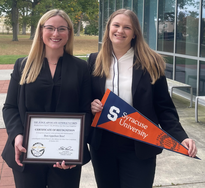 “I want to congratulate Emma and Elyse for their double accomplishments at this prestigious competition. I also want to thank Captain Van Erp, who has expertly coached numerous Syracuse Law appellate teams, generously and graciously volunteering his time,” said Professor Todd Berger, director of Advocacy Programs at Syracuse Law.